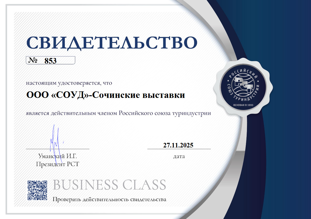 Компания СОУД - Сочинские выставки 27 ноября 2025 года возобновила своё членство в Российском Союзе Туриндустрии.